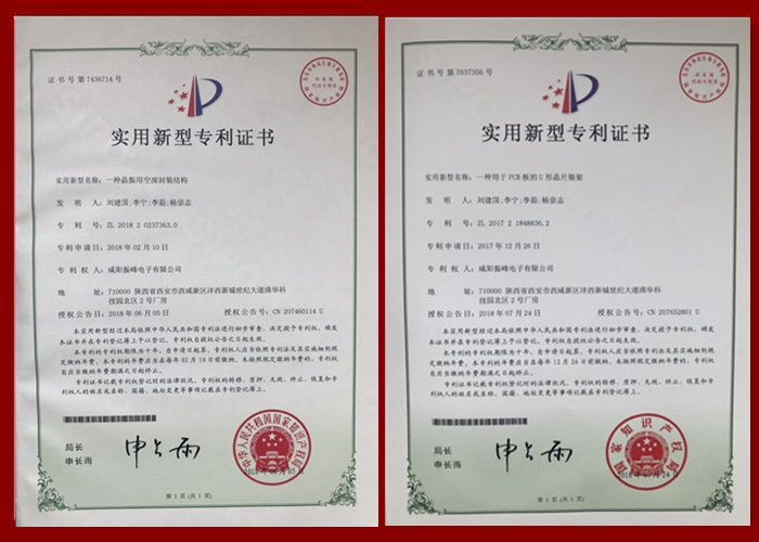 振峰电子晶体滤波器.晶体振荡器及晶体谐振器部分专利证书